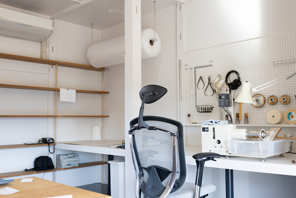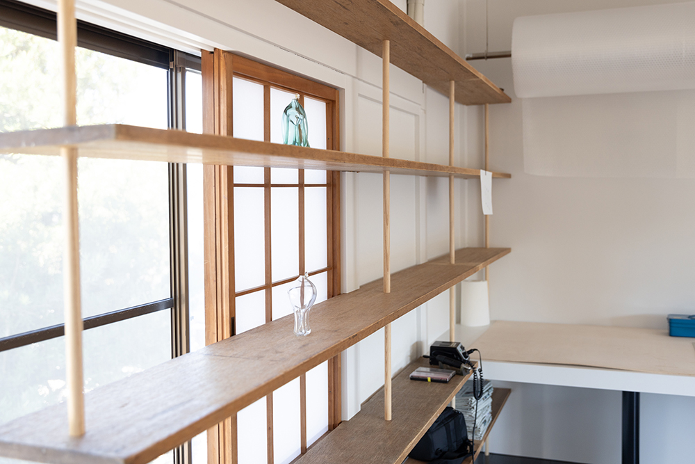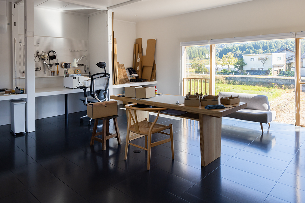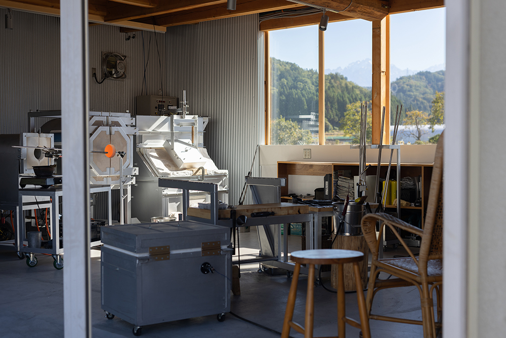 隣接する倉庫は、ガラス制作の工房・事務所としてリノベーション。広く空いた窓から雄大な立山連峰と周囲の自然を楽しめる気持ち良い工房になった。