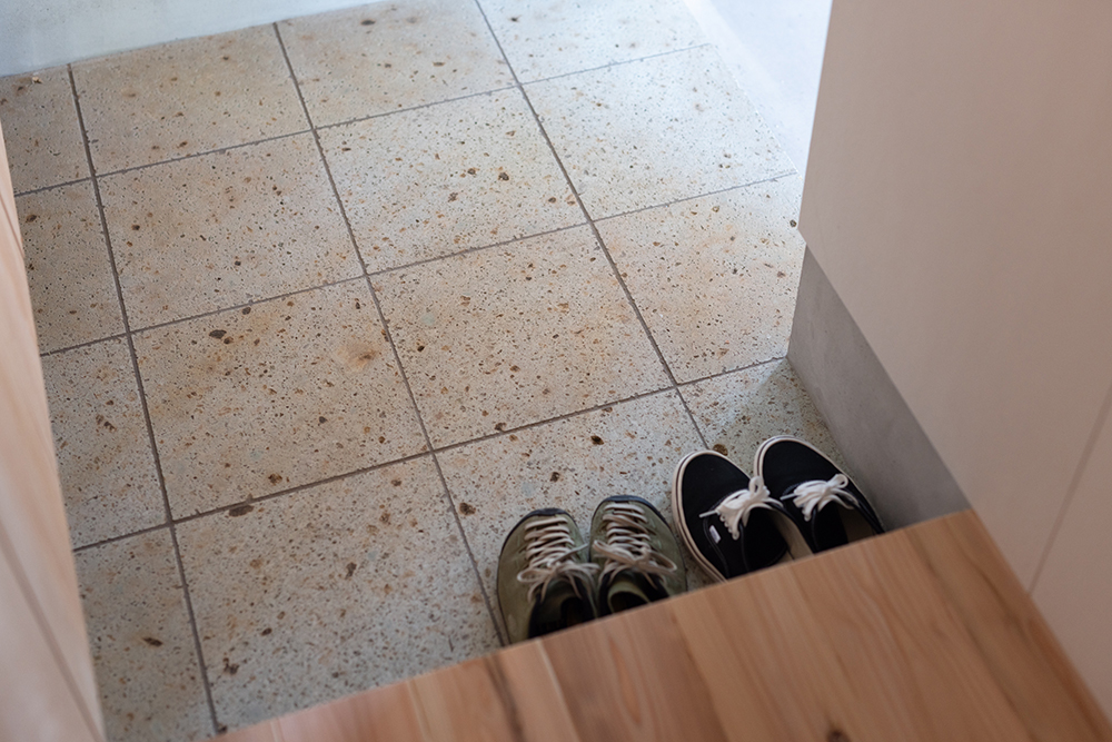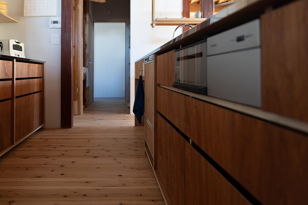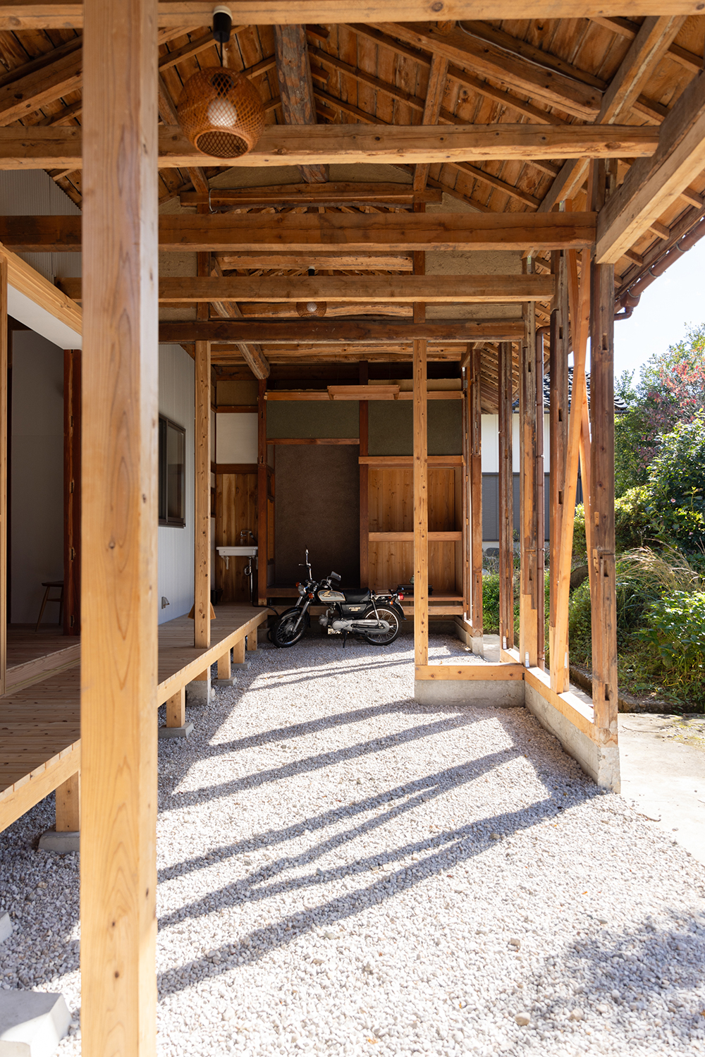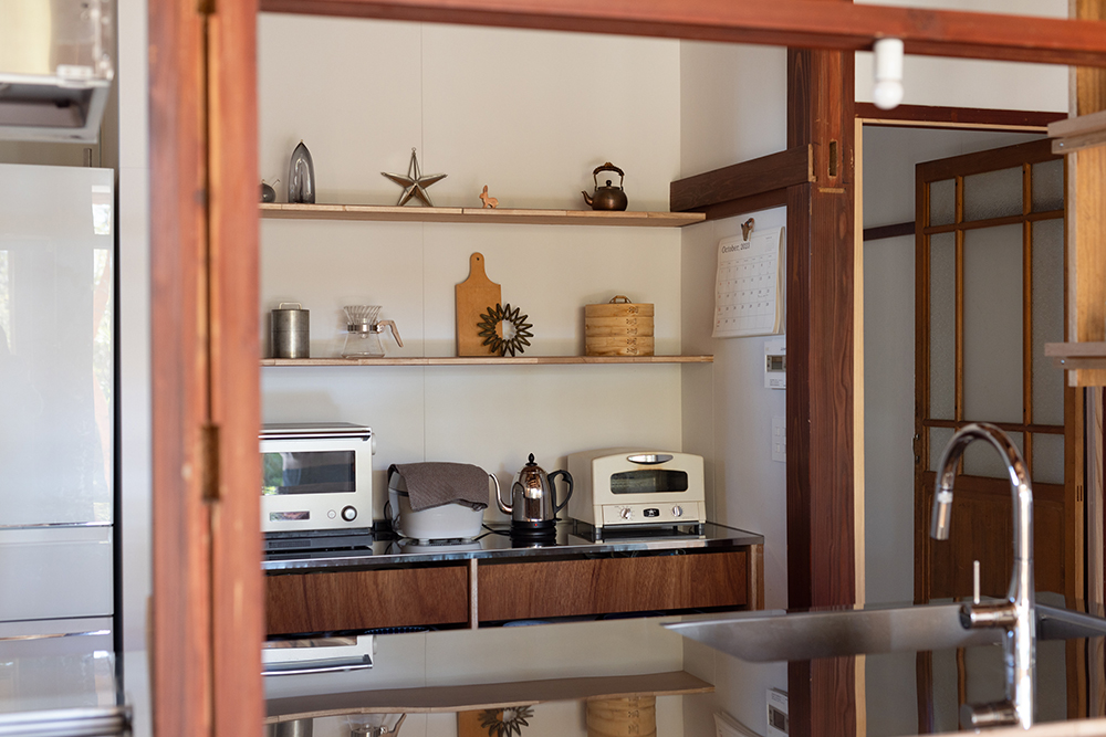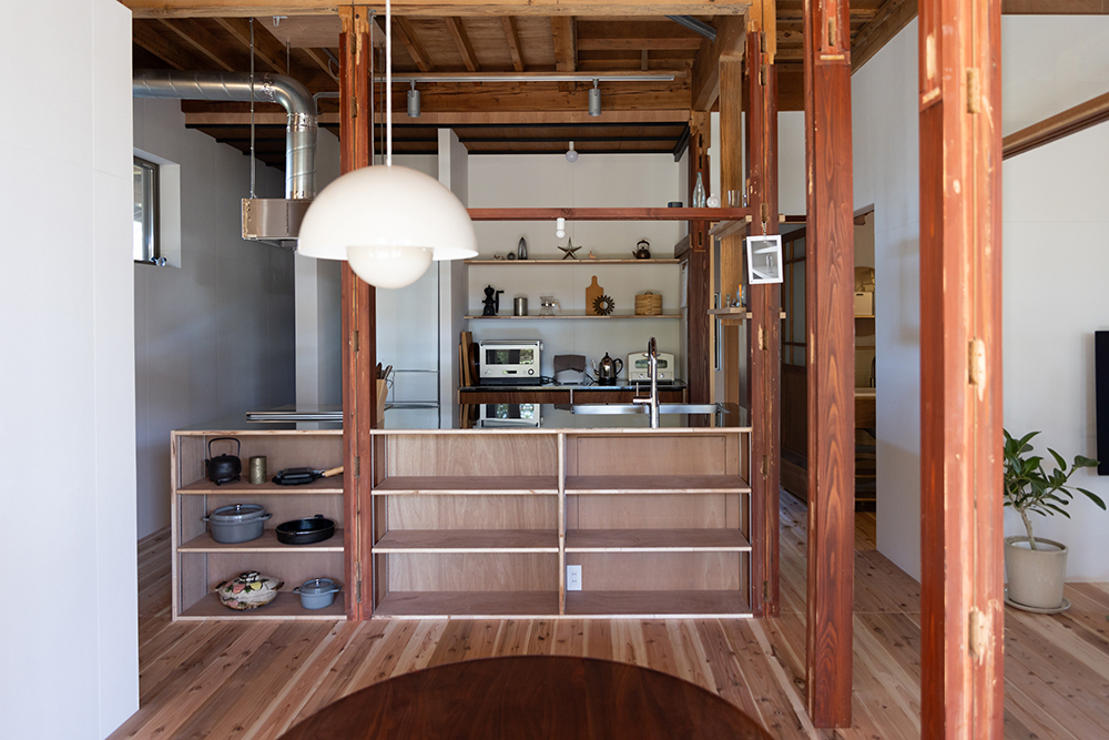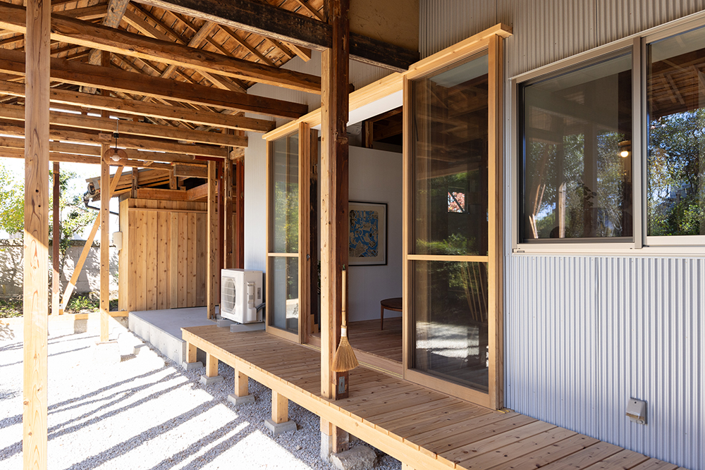 元々は居住空間であった大正時代に建てられた部分は、損傷が激しかったため、柱と屋根だけを残して深い軒がある庭に。増築された比較的新しい部分のみ、居住空間としてリノベーションすることにした。床には無垢の杉板、壁は調湿効果があるケイカルの素地を使用し、カラッと澄んだ空気が気持ちの良い空間になった。