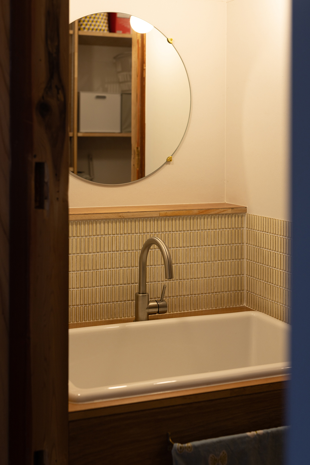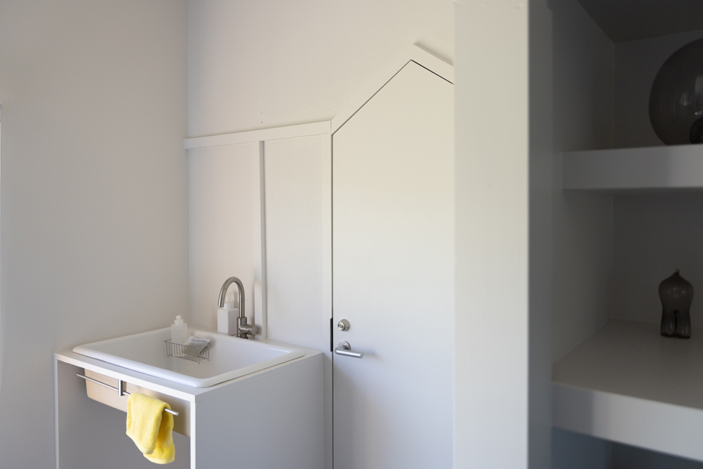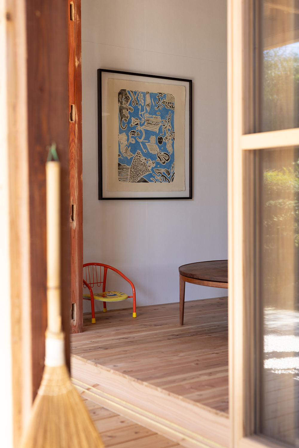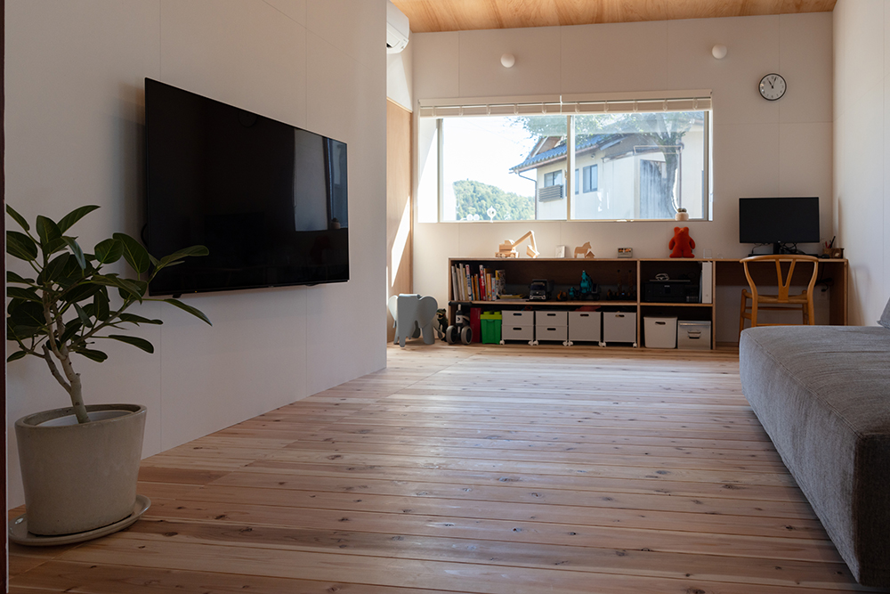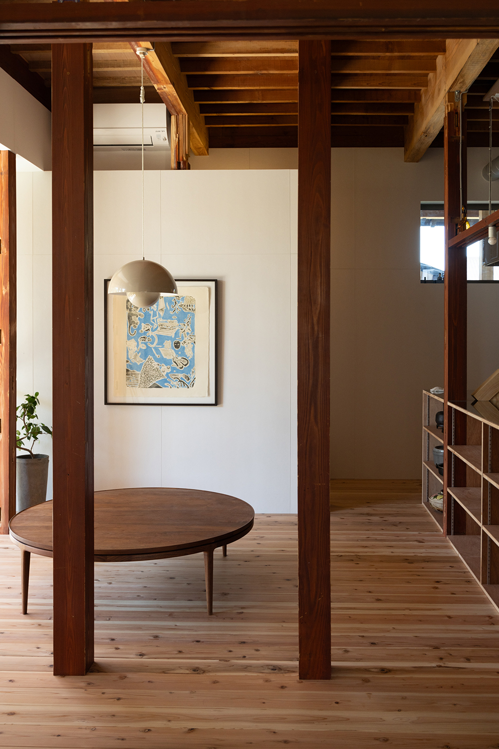 元々は居住空間であった大正時代に建てられた部分は、損傷が激しかったため、柱と屋根だけを残して深い軒がある庭に。増築された比較的新しい部分のみ、居住空間としてリノベーションすることにした。床には無垢の杉板、壁は調湿効果があるケイカルの素地を使用し、カラッと澄んだ空気が気持ちの良い空間になった。